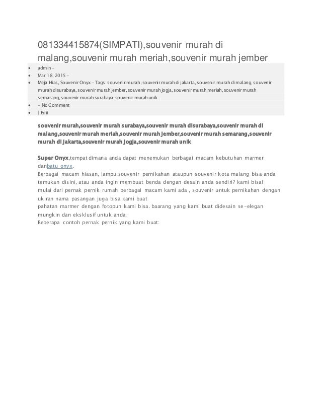 Toko souvenir di malang murah pusat toko souvenir murah. Kami adalah toko souvenir pernikahan murah yang siap melayani pemesanan untuk kota kota seperti malang, surabaya, jogja, solo, semarang, tangerang, bandung dll kami adalah toko souvenir pernikahan yang siap melayani pemesanan produk seperti sendok, handuk, gantungan kunci, kipas, dll buat kenang kenangan di pesta / hajatan anda. 15 tempat wisata di kota tua yang paling bagus dan hits. Tempat wisata di kota tua inilah daftar rekomendasi aneka tempat wisata di kota tua jakarta dan sekitarnya yang paling bagus serta hits.Lengkap dengan review nama objek wisata, daya tarik, lokasi/alamat, harga tiket masuk, hingga jam buka operasionalnya. Tips ke jogja tips wisata murah home. Sosrowijayan merupakan sebuah area yang berada di jalan kecil di daerah malioboro, atau sekitar 200 meter dari stasiun tugu. Selain tempatnya strategis banyak tersedia berbagai hotel dengan tarif yang murah, per malam hotel bintang satu rp 101.000. Tumblerlogo, jual tumbler souvenir grosir murah di malang. Jual tumbler souvenir grosir murah di malang kota malang merupakan salah satu kota besar di jawa timur dan indonesia. Kota ini merupakan salah satu kota bisnis selain surabaya. Dengan jumlah populasi yang besar dan juga banyak kegiatan ekonomi di kota ini membuat banyak perusahaan yang membuka cabang di sini. Tas souvenir di malang tassouvenirmalang. Tas souvenir malang, tas spounbond! Tas spounbond cocok untuk shopping bag anda. Untuk souvenir acara juga oke ! Ukuran 30 x 22 cm, rp 1500 per 1000 pcs. Min order 100 pcs. Shopping bag murah di malang ya di tas souvenir. Cara pesan mudah banget, tinggal sms/wa ke 0858 515 70655 ( no call ). Silahkan mau tanyatanya langsung hubungi cp yaa !
